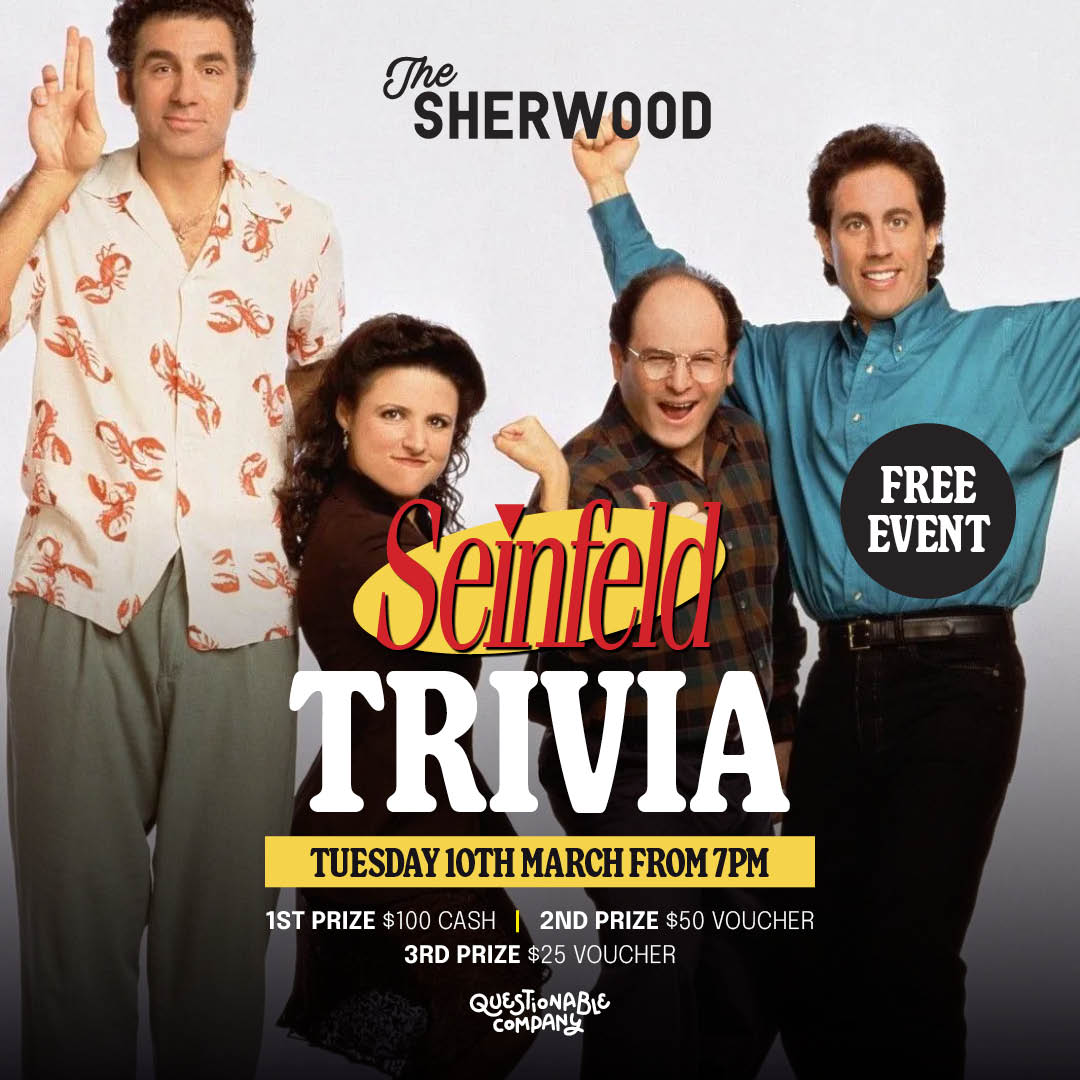 Grab your mates and head to The Sherwood for our Seinfeld Themed Trivia night. Tuesday 10th March from 7pm. FREE EVENT -...